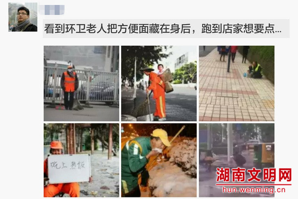 湖南文明网12月11日讯(通讯员 邓军 记者 潘锦)“看到环卫老人,把方便面藏在身后,跑到店家想要点开水,因为不好意思开口,徘徊了好久又默默地离开,太心疼老人。恳请政府和各位商家在这样的天气里为环卫工人提供取暖场所和热水,不要令这群拿着社会最低工资的人在没日没夜劳作后,还在寒风中吃着冰冷的饭菜。”近日,这条微信在朋友圈广泛转发,也牵动着第十一、第十二届全国人大代表、老百姓大药房董事长谢子龙的心。