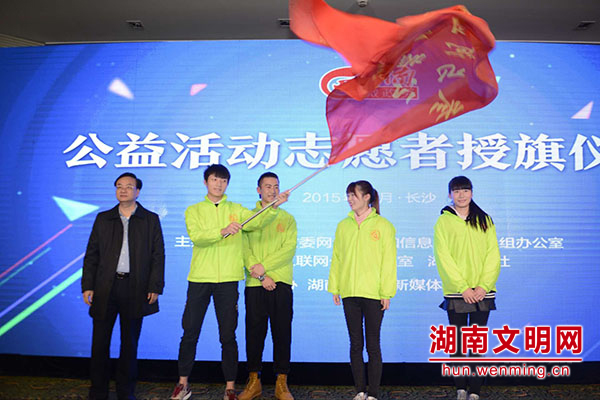 湖南省副省长李友志为参加河道保洁的志愿者授旗