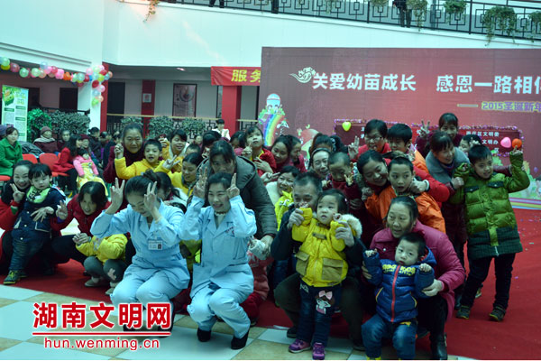 孩子们和照顾他们的长沙市残疾人康复中心医护人员合影