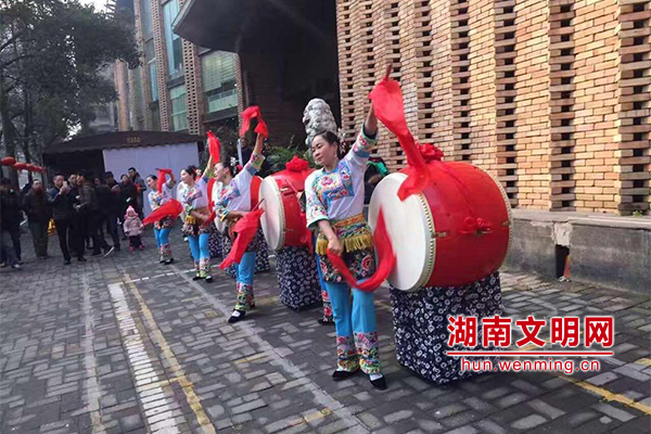 当日,在古玩城会场入口处,湘西苗族鼓舞成为一道靓丽风景线,吸引了众多市民的目光。擂鼓的4位苗族姑娘踏着独有的节拍,将苗鼓气势及美感演绎到了极致。据主办方统计,博览会今天吸引了数万市民观展。