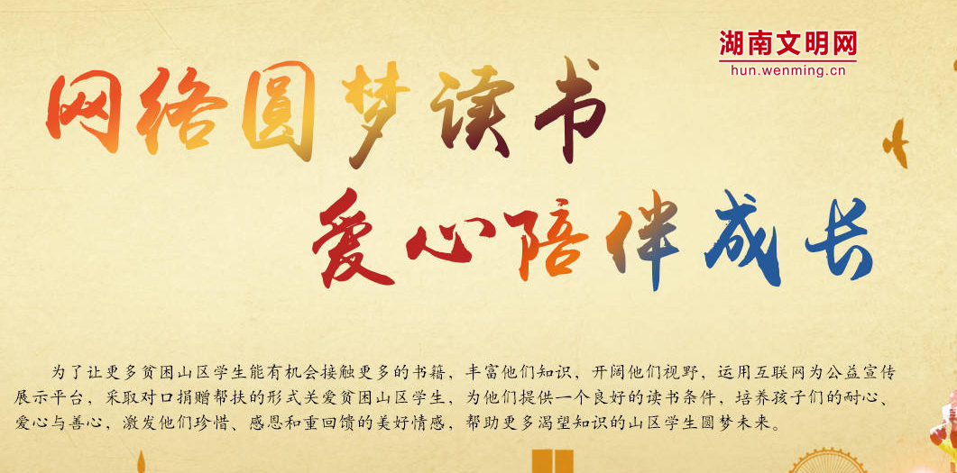 书香传递,精准扶贫。由湖南文明网、长沙市岳麓区委宣传部、湖南娱乐频道《我是大赢家》联合发起的“网络圆梦读书,爱心陪伴成长”读书笔记公益活动正在行动。