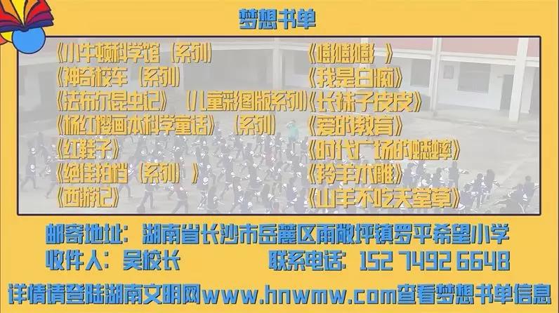 如果您的书架上刚好有刘博文和他同学们的梦想书籍,又或者您乐意为她们买书,请将书邮寄到长沙市岳簏区雨敞坪镇罗平希望小学,收件人:吴校长,电话是15274926648 。更多活动详情请登陆湖南文明网,关注“网络圆梦读书 爱心陪伴成长”专题。最小的力量,就是最大的支持!您的慷慨捐赠将为孩子们撑起知识的晴空。(来源:我是大赢家微信公众号)