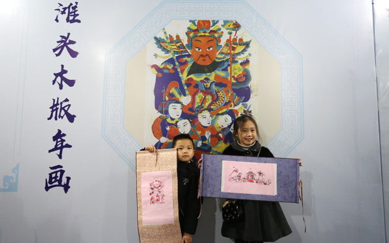 两位小朋友展示自己现场制作的滩头木板年画。图片来源:湖南文明网 记者 彭团 摄