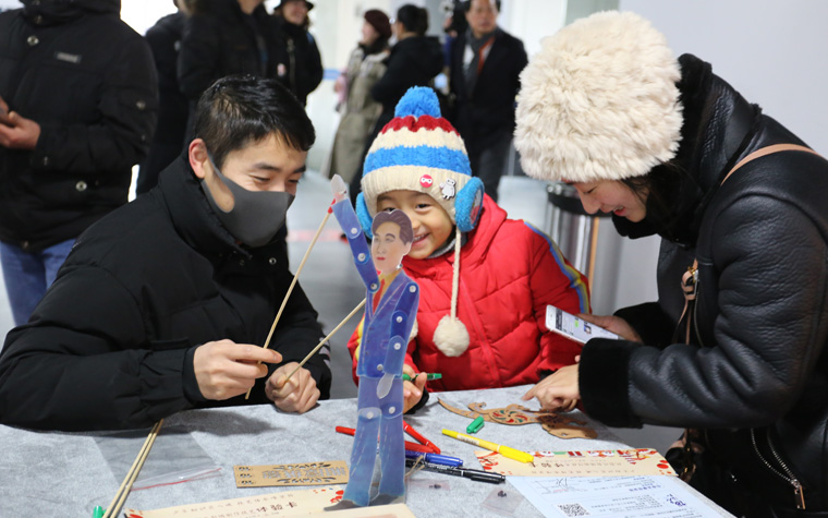 一位小朋友被鲜艳的影偶吸引。图片来源:湖南文明网 记者 彭团 摄
