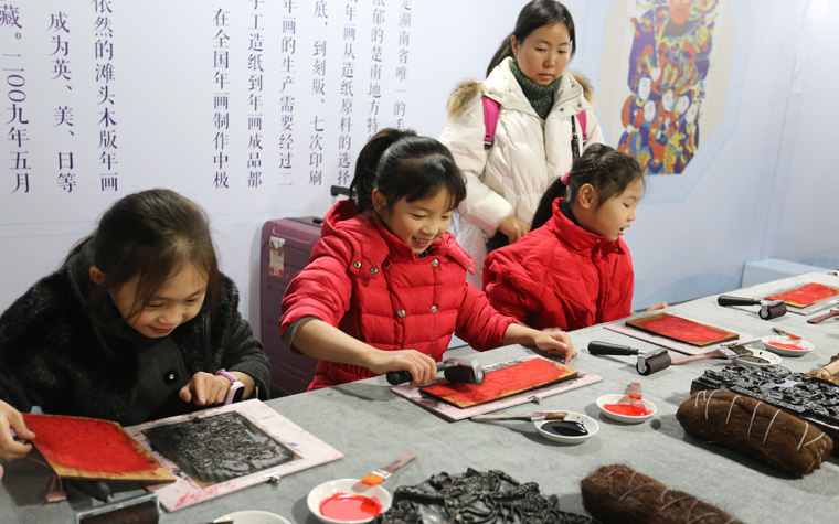 青少年体验制作滩头木板年画。图片来源:湖南文明网 记者 彭团 摄