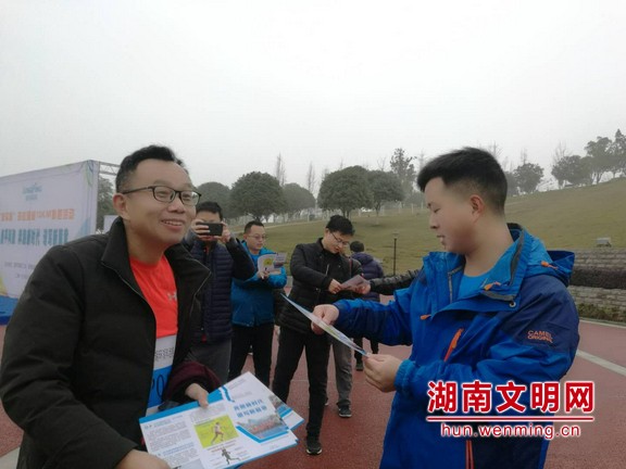 志愿者向跑友和游客发放资料。图片来源:湖南文明网