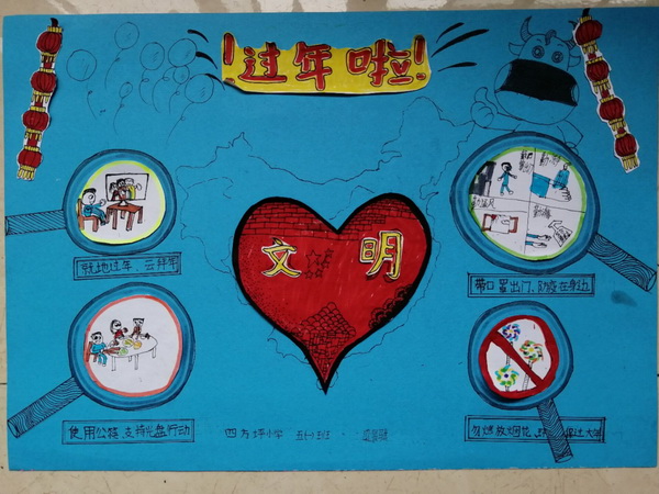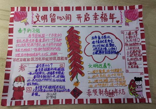 来自湖南各地的未成年人围绕“文明心间留·开启幸福年”主题,以倡导移风易俗过大年、传播文明生活理念、共享爱卫防疫习惯等为主要内容,创作包含绘画、手抄报、书法、视频等多种形式的原创作品倡议大家“就地文明健康过大年”。