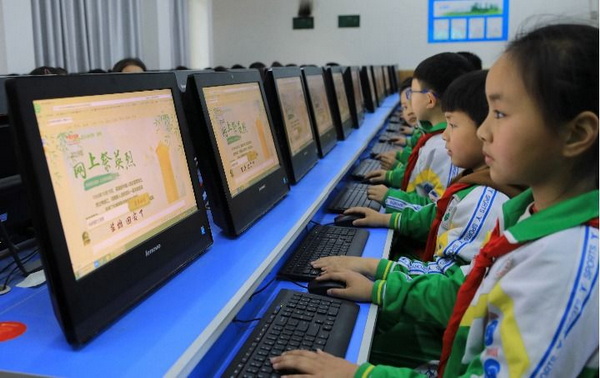 2019年4月3日,湖南吉首大学师范学院附属小学的学生们参加网上祭英烈活动。图片来源:新华社 彭彪 摄