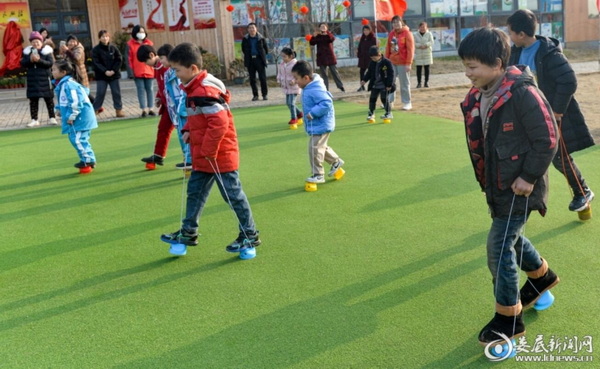 实践基地的志愿者带领孩子们踩高跷 摄影/刘新山