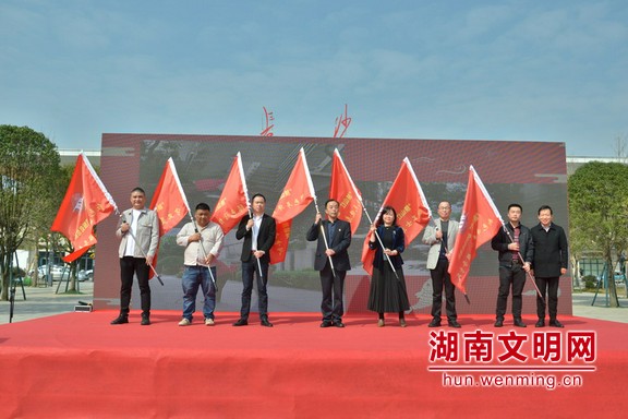 “映山红”志愿服务项目启动,各志愿服务分队负责人上台接旗。图片来源:湖南文明网 记者 彭团 摄