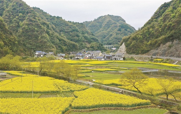 3月24日,张家界市武陵源区协合乡杨家坪村,油菜花、绿树、民居和桥梁相映,勾勒出一幅美丽的乡村田园画卷。吴勇兵 摄
