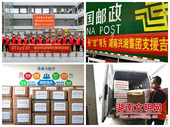 “守望‘湘’助,积‘吉’作为,吉林加油!”在防疫物资捐赠仪式中,湖湘儿女齐声高喊出这一句振奋人心的口号,向吉林人民传递出爱心和力量。