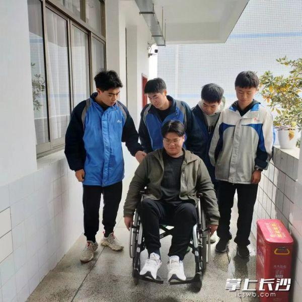 浏阳市五中校园里,久违的阳光透过窗户洒向高三384班。下课铃声响了,一个瘦瘦高高的男孩推着一名坐在轮椅上的同学走出教室,来到阳光下。