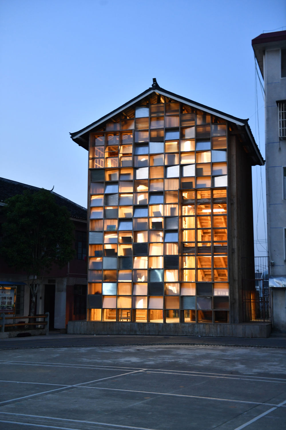 学生们一出教室,就能与美丽的坪坦书屋相遇。为了建设书屋,坪坦乡中心小学校长侯志敏与设计方团队商量,拆除了操场旁边的一间柴棚。坪坦书屋建筑面积180平方米,为三层木质建筑,采用侗族建筑传统技艺营造,两部木楼梯自下而上于顶上“相遇”,书屋外墙由书架、半透明胶板、玻璃窗组成,透过窗户可以俯瞰校外的稻田。