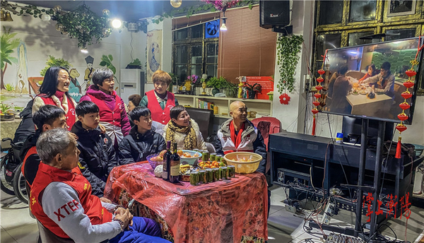 除夕夜,志愿者陪伴留守儿童和孤寡老人一起看春节联欢晚会。图片来源:掌上衡阳