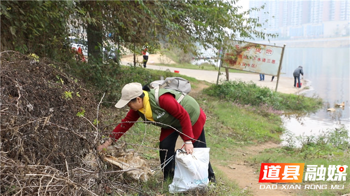 在道县上关码头,志愿者们化身“河小青”,手拿铁钳、垃圾桶各种工具,对潇水河沿河草丛里的废弃物、白色垃圾进行清理,对于挂在树枝上、埋在土中以及掉落在河岸边等不易清理的垃圾,“河小青”们深入树林、草丛、河滩等复杂地形,采取互相配合、定点清理的方式,确保做到垃圾清零。