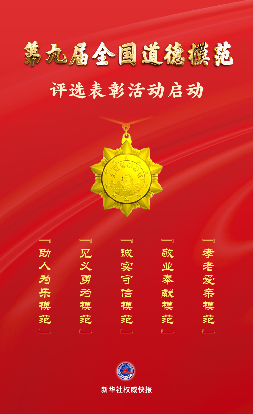 据悉,第九届全国道德模范分为“助人为乐模范”“见义勇为模范”“诚实守信模范”“敬业奉献模范”“孝老爱亲模范”5个类别,通过群众推荐、遴选审核、公示宣传、投票评选等步骤评选产生。(记者 董博婷)