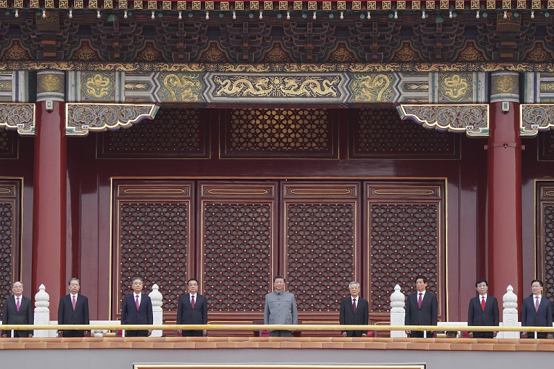 上午7时53分,在欢快的乐曲声中,习近平等党和国家领导人来到天安门城楼主席台,全场爆发出热烈掌声。