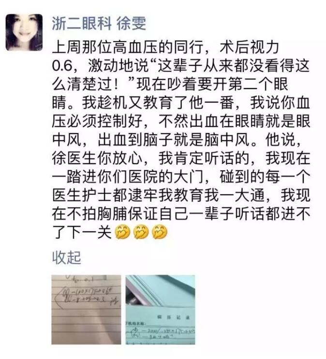 令人高兴的是,前两天,回医院复查的叶先生视力恢复得很好。右眼手术很成功,术后视力已经到0.6,左眼也即将手术,现在的血压也比较稳定。
