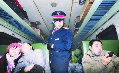 列车员王钊在车厢巡查。记者 朱波摄