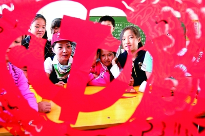 党员通过剪纸等形式为小学师生讲解党史。