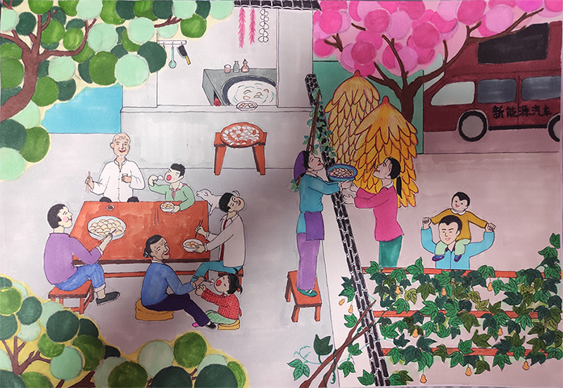 作品说明:《爷爷的家》。我问妈妈什么是小康生活?妈妈说爷爷家以前是贫困县,村里更是没有路灯。现在村里的马路干净整洁,许多小朋友到了晚上都喜欢在路灯下踩影子玩。鸡鸭鱼肉不再是过年时候的奢侈品,更是家家有车。这就是小康生活。