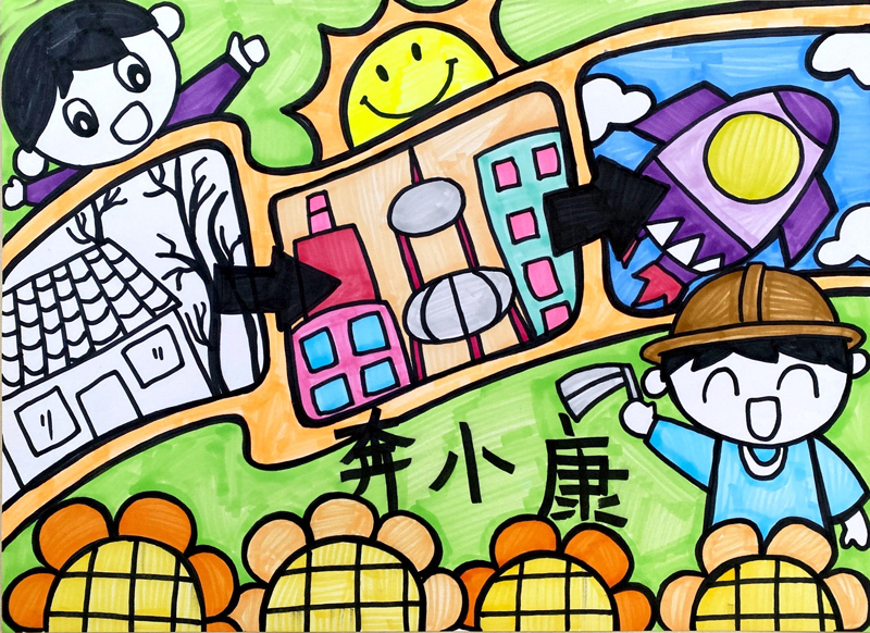 作品说明:打赢脱贫攻坚战,其含义不仅在于“摘穷帽拔穷根”,更在于“全面小康一个都不能少”。在画中孩子用画笔画出了我们的国家这几年的改变,在全国人民的共同努力下,我们的祖国繁荣昌盛,我们的幸福感不断提升。