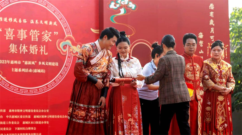 “繁茂桃花十里香,九月佳人上红妆。十里红妆明媒娶,金凤展翅凤求凰……”近日,在广东省惠州市惠城区下源村,一场文明简约的新中式集体婚礼热闹举行。4对新人华服彩披,尊传统礼制,行婚典之仪,在亲朋来宾的祝福下携手走进了婚姻殿堂,让阵阵文明新风吹入人心。