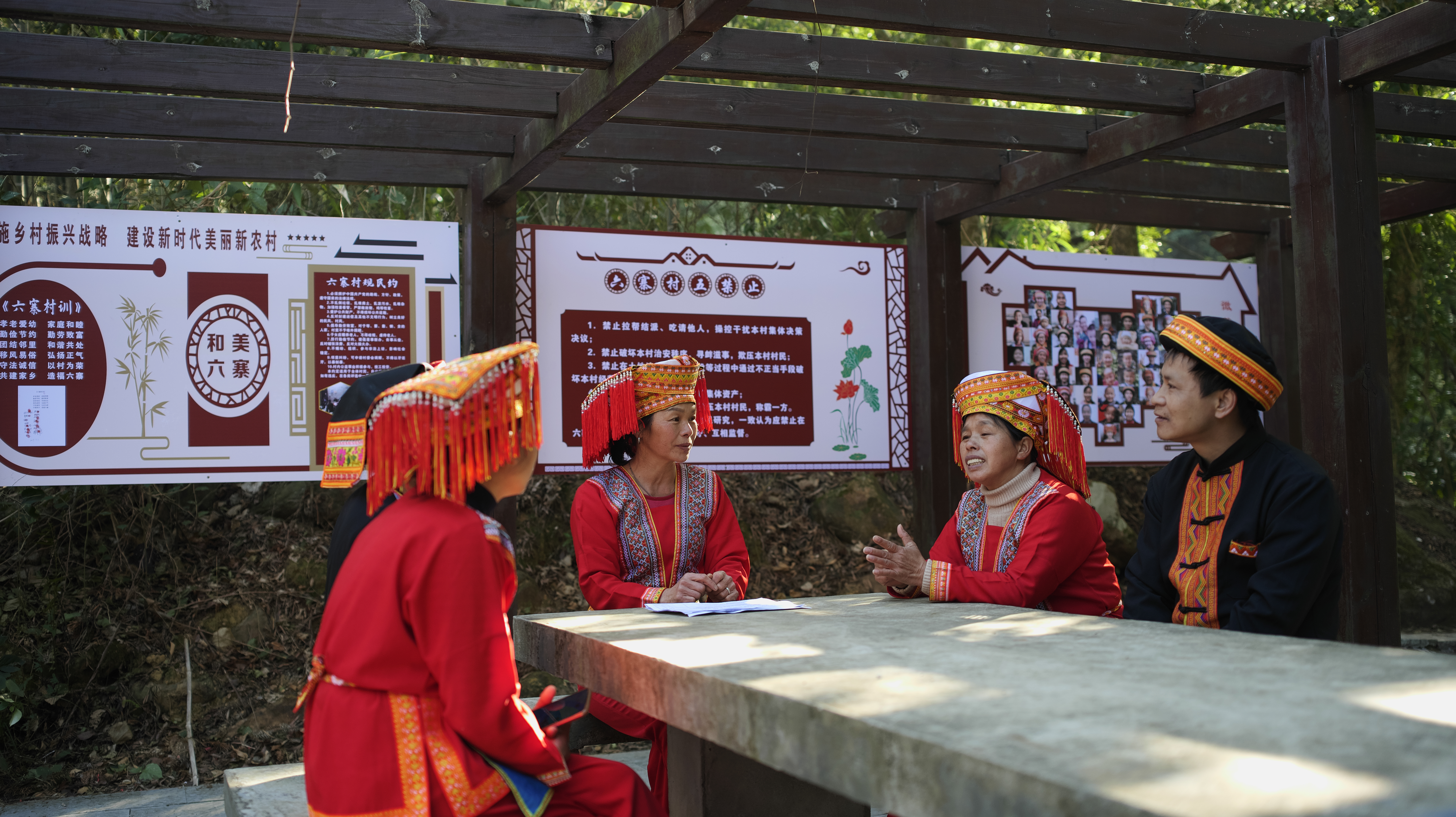 村民在夏宜村新时代文明实践站议事亭里“话”团结。