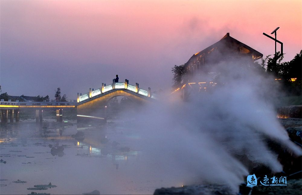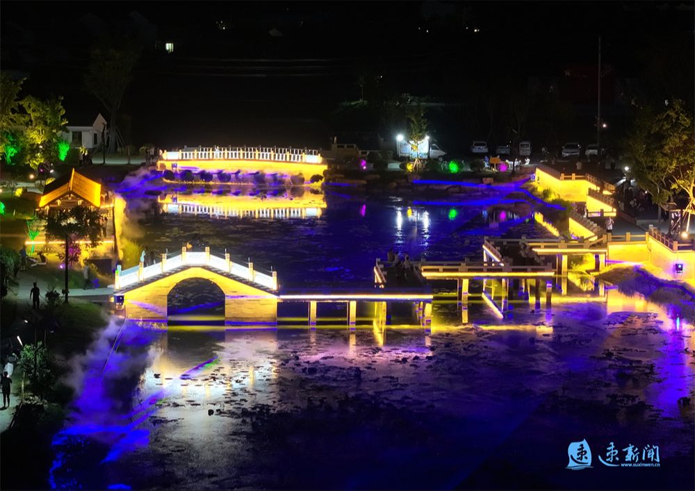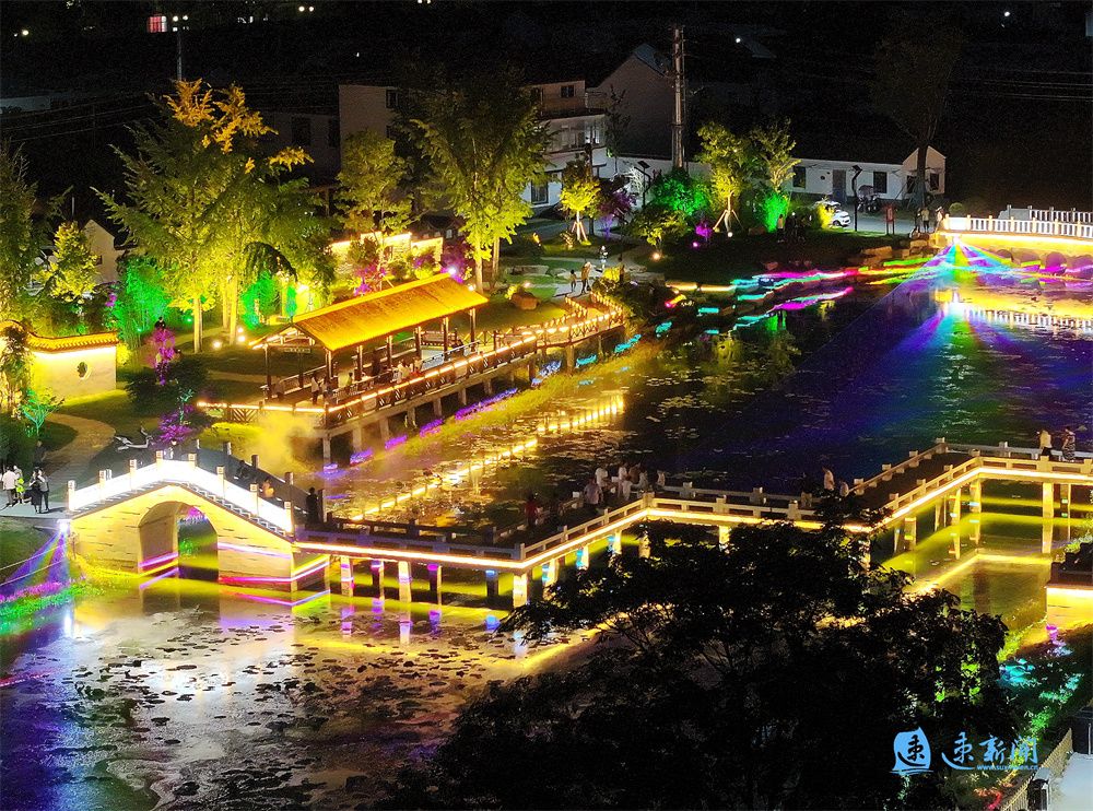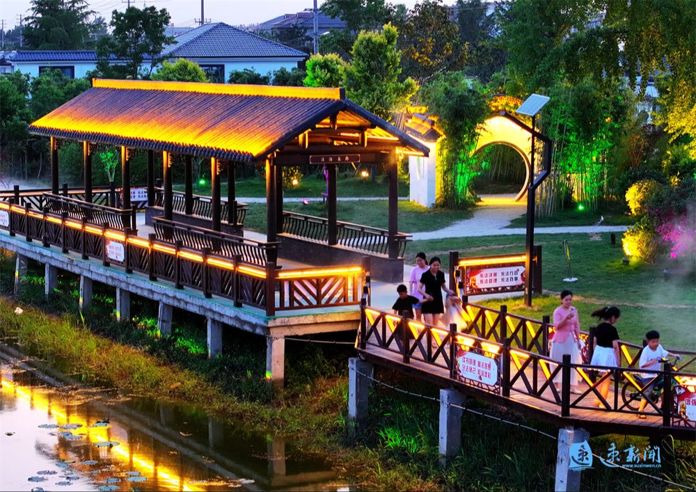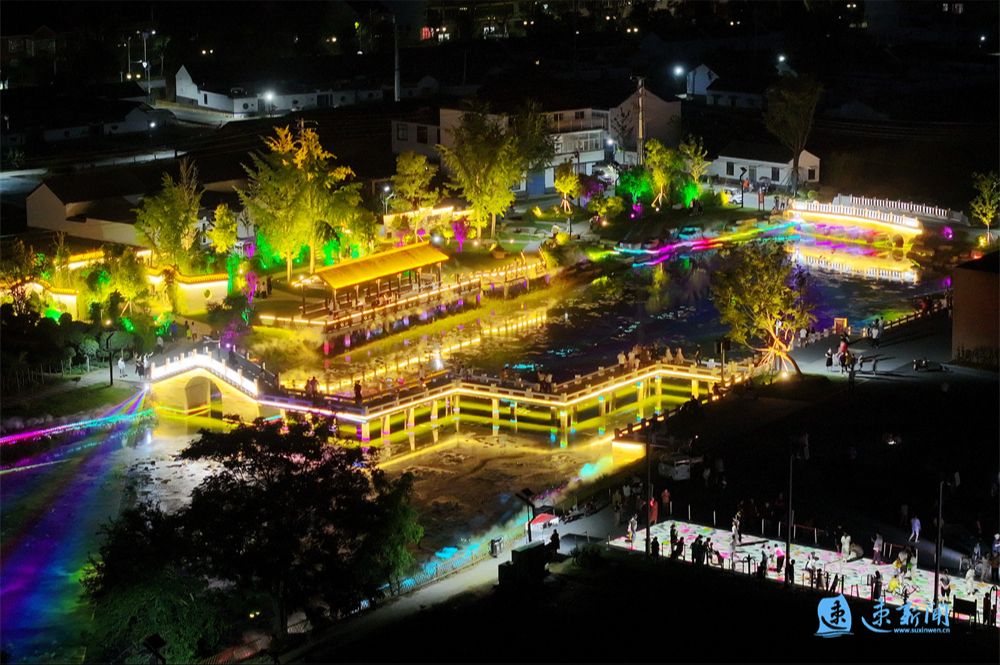 6月11日晚,沭阳县青伊湖镇滥洪社区的小元庄里灯光璀璨,清清的荷塘,小桥流水,休闲亭台,为村民们提供了休闲娱乐的空间,呈现一派美丽的乡村景象。