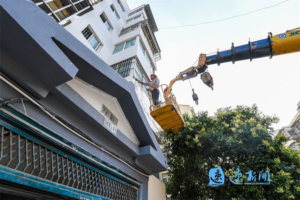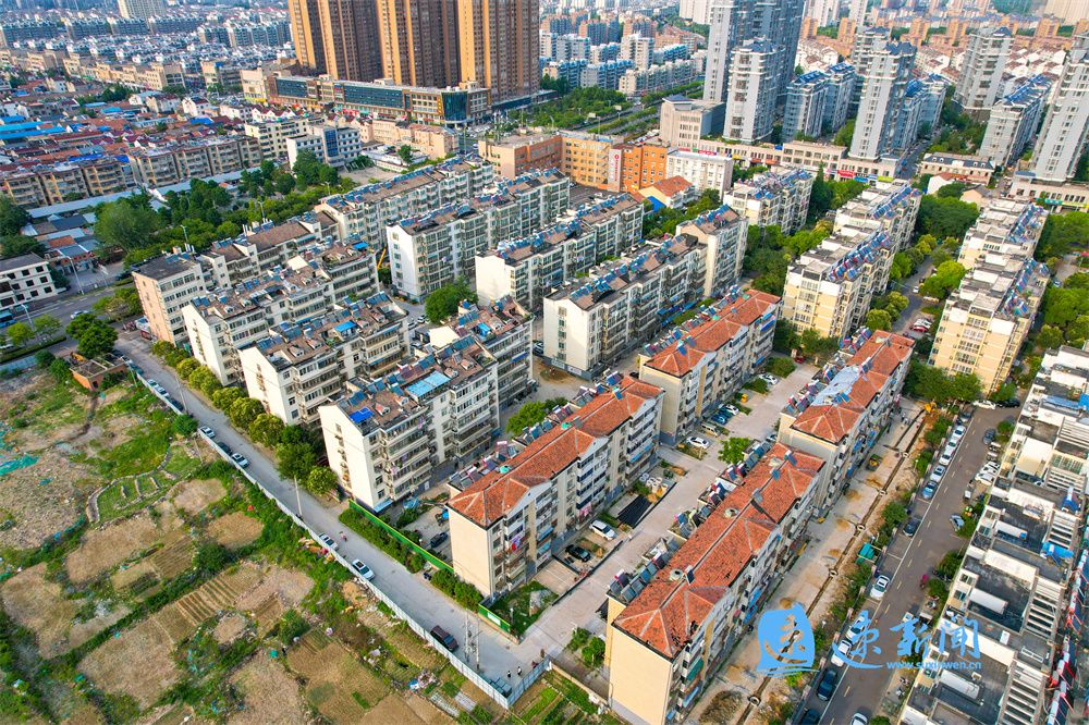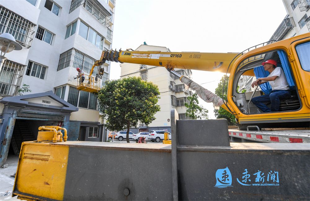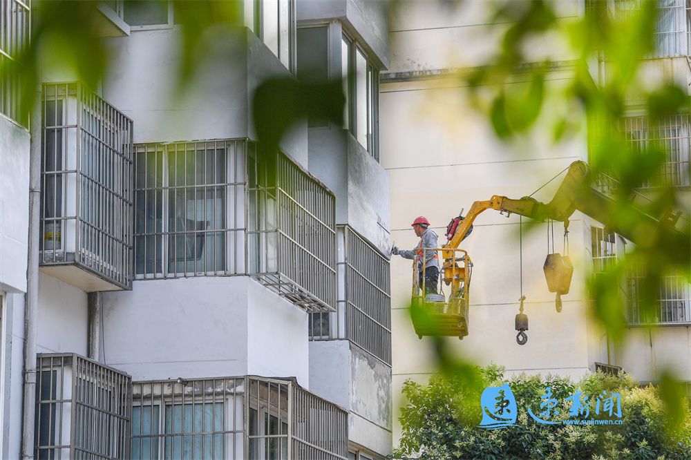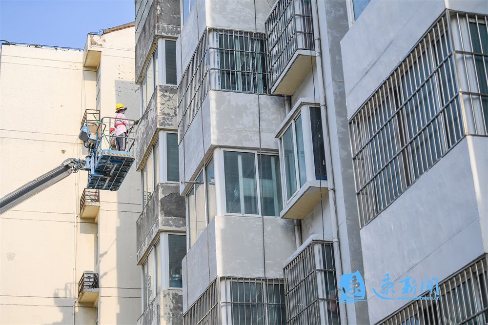6月11日,在宿迁市泗洪县蓝天小区里,工人对外墙进行施工作业。近年来,该县持续推进老旧小区改造工作,着力开展并实施外墙立面修复、屋顶漏水修复、绿化补植提升、监控及亮化系统完善、非机动车停车充电、通信管线整理等改造,为群众打造更加安全宜居的家园,不断提升群众幸福感。(来源:速新闻 朱峰 摄)