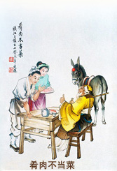 老者十分固执,男人见拗不过他,只得切了一盘端上来,怕有腥味,还特意配了一碟香醋和一碟姜丝。老者眉开眼笑,边喝茶边蘸醋就着姜丝不一会就把一盘肉啖个精光。吃罢出门,心满意足地倒骑着毛驴赶路去了。传说,这老人便是八仙之一的张果老,在去瑶池参加蟠桃大会途中经过镇江,被一阵肉香所吸引,故翩然降下云头一尝为快。从此,便有了硝肉的加工方法,也有了喝早茶吃硝肉的习俗。后来,念着传着传着念着,“硝”字便念成了“肴”。