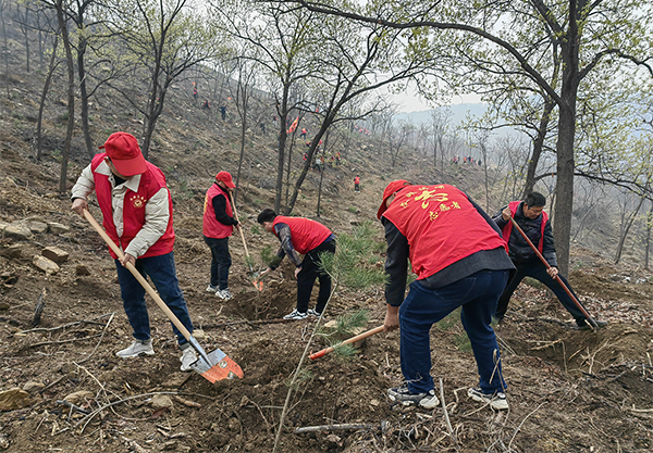 雨后的植树现场略显泥泞,干部职工热情高涨,两人一组,挥锹铲土、扶树正苗、培土围堰,细致地完成每一道工序,精心栽下一株株树苗,经过分工协作,一百余棵白皮松、元宝枫全部栽植完毕,原本空旷的坡地被绿色的树苗点缀,呈现出一片生机勃勃的景象。