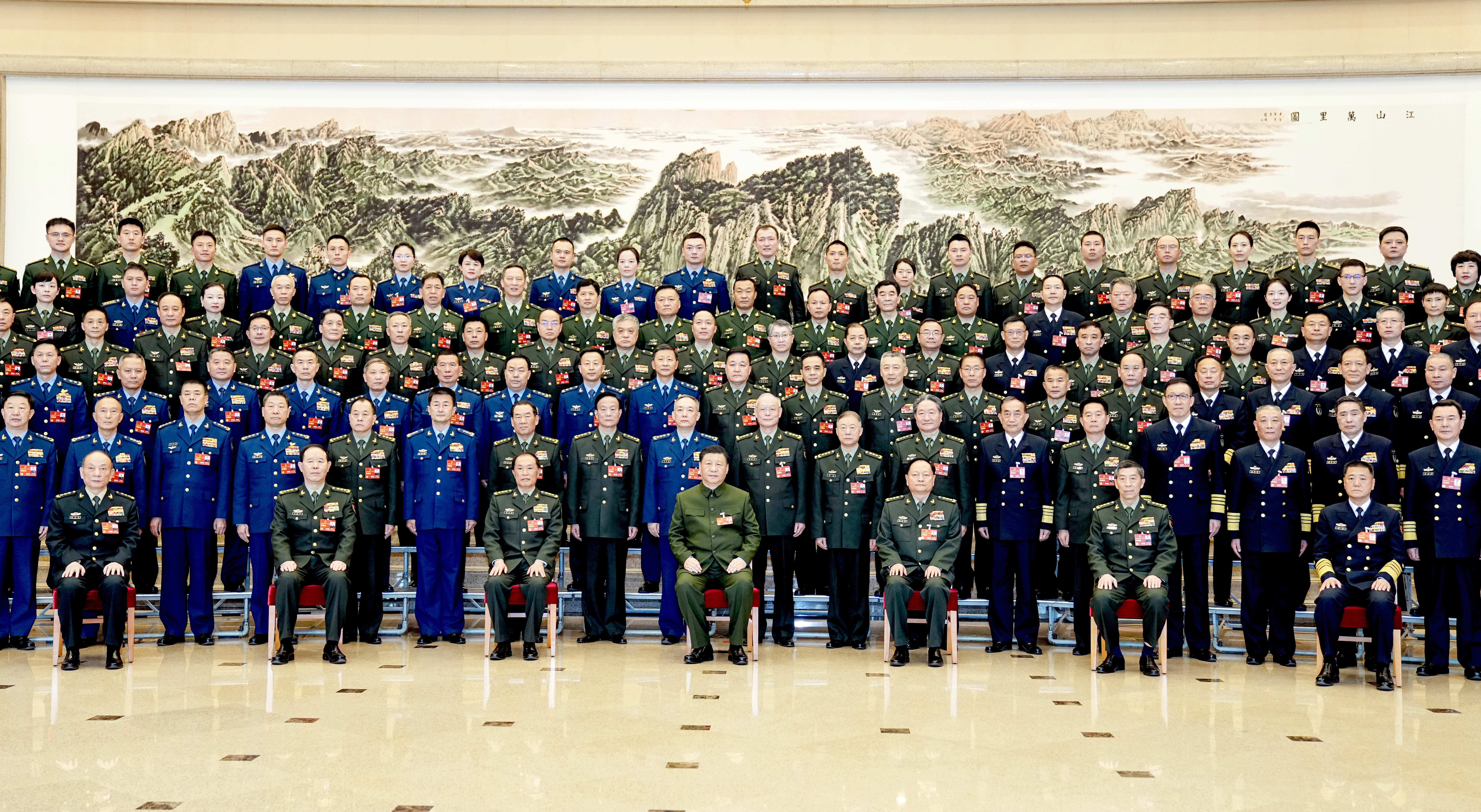 3月8日下午,中共中央总书记、国家主席、中央军委主席习近平出席十四届全国人大一次会议解放军和武警部队代表团全体会议。这是会议开始前,习近平亲切接见代表团全体代表,并同大家合影留念。新华社记者 李刚 摄