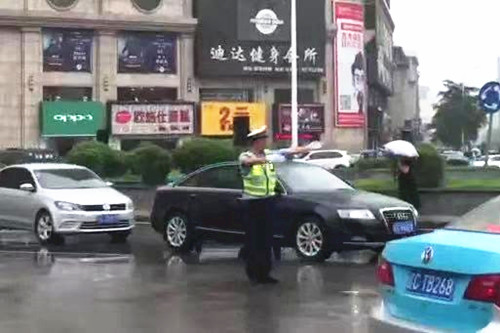 在几天的暴雨中,百名交警在岗在位,一直坚守在工作第一线,尽管在风雨中我们看不清他们的脸,但他们却是风雨中一道坚挺的风景线。 (市融媒体中心记者 刘志岩)
