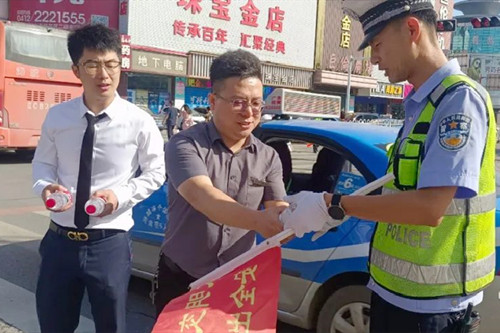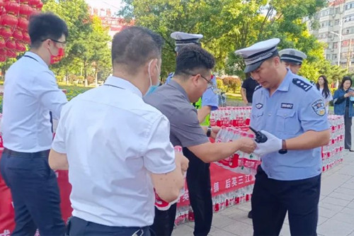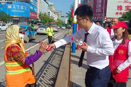在新华岗,后英地产销售经理吕岩带领工作人员将一瓶瓶矿泉水送给正在执勤的交警和志愿者,随后,又和市融媒体中心的志愿者一道,将矿泉水送给正在街边保洁的环卫工人,向他们道一句“辛苦啦!”