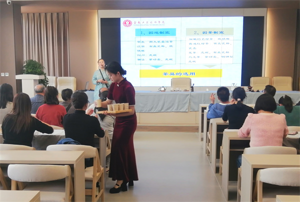 “烤茶主要是激发茶的香味”“盖碗可以控制茶的浓度……”,活动当天,当各项室外活动开展完毕后,大家又集中到室内,一起参加茶艺课堂培训学习,让大家在更加放松的环境中,边喝茶、边学习了解茶具以及泡茶流程等相关技能。
