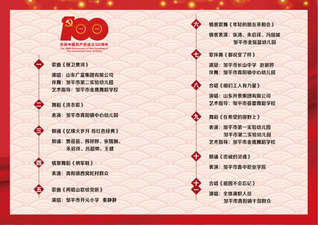 为庆祝中国共产党成立100周年,深化党史学习教育和全国文明城市创建工作,引导广大党员干部学史明理、学史增信、学史崇德、学史力行,学党史、悟思想、办实事、开新局,为“奋战十四五,再造新邹平”凝聚强大发展合力,中共邹平市委宣传部、中共邹平市委党史学习教育领导小组办公室主办了 “红色初心 赓续百年——歌声中的党史”走进青阳活动。邹平市委党史学习教育领导小组办公室联合邹平市新时代文明实践指导中心以“红色初心 赓续百年”为主题,策划了“歌声中的党史”“舞蹈中的党史”“书香中的党史”“行进中的党史”“影像中的党史”等分众化、对象化、互动化的新时代文明实践系列活动,全面营造“党的盛典——人民的节日”浓厚社会氛围。