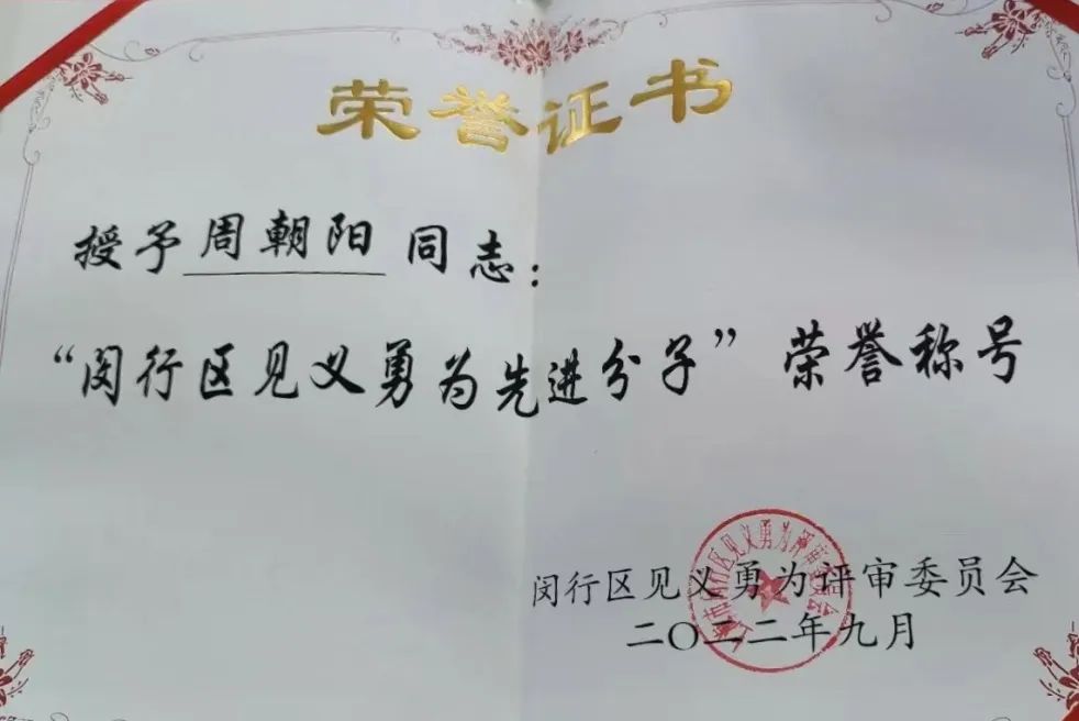 日前,在2022年度上海市见义勇为先进(群体)表彰会上,浦锦街道的周朝阳被授予“上海市见义勇为先进”荣誉称号。在今年9月,他被授予“闵行区见义勇为先进分子”荣誉称号。他纵身一跃,彰显出时代青年英勇无畏的高尚品格。