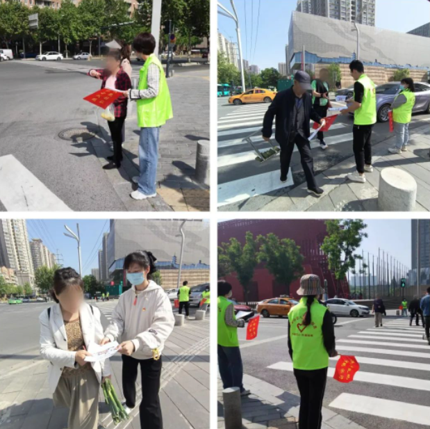 4月27日上午9:00,西安市第八医院组织相关党员干部及志愿者来到医院周边人流量、车流量较大的“明德门十字”开展文明交通引导活动。志愿者们身穿志愿者服装,手持“遵守交规 文明出行”小红旗,通过手势、语言劝导等方式,对行人横穿马路,非机动车不按规定行驶等不文明行为进行劝阻和引导;党员干部向过往群众讲解交通安全知识,发放《西安市文明行为促进条例》“14种不文明行为要处罚”等宣传资料,引导市民群众和非机动车、机动车驾驶人自觉遵守交通法规、文明礼让通行,提升文明交通安全意识,做到安全文明出行,用实际行动传递“文明交通从我做起”的正能量,营造和谐文明的道路交通环境。