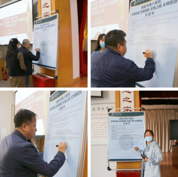 4月28日下午,由创文办组织在五楼会议室开展了西安市第八医院“文明交通 文明用餐 文明上网 文明旅游”承诺书签订仪式。签订承诺书之前,创文办向全院干部职工发出了自觉践行“文明交通 文明用餐 文明上网 文明旅游”的倡议,与会党员干部职工积极响应,纷纷在承诺书上签名承诺。