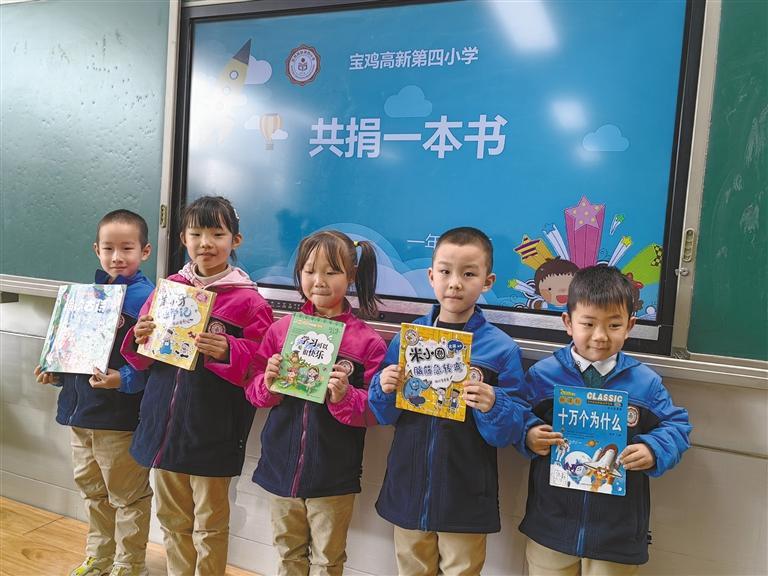 宝鸡高新第四小学于3月15日启动第七届童彩读书节活动,让书香浸润校园。图为该校学生为班级捐赠图书。