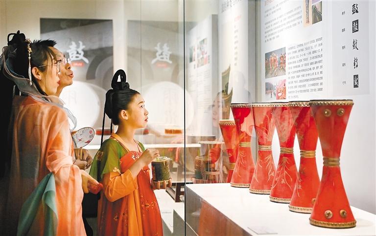 5月1日,游客在西安市钟鼓楼博物馆参观鼓manbetx安卓手机 展。 新华社发