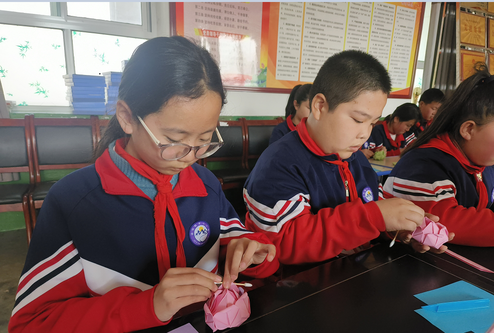 老师先用视频给大家展示了玫瑰花的折法;然后给学生做示范,让孩子们边看边做。看看孩子们多么认真!