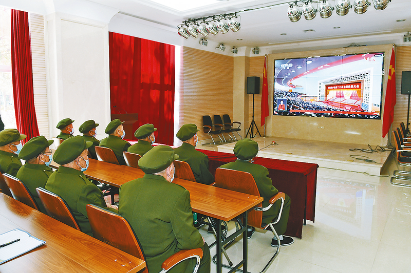 延安市八一敬老院老红军、老八路及革命老战士与市退役军人事务局干部一起收看党的二十大开幕盛况。 记者祁小军摄(图片来源:延安日报)