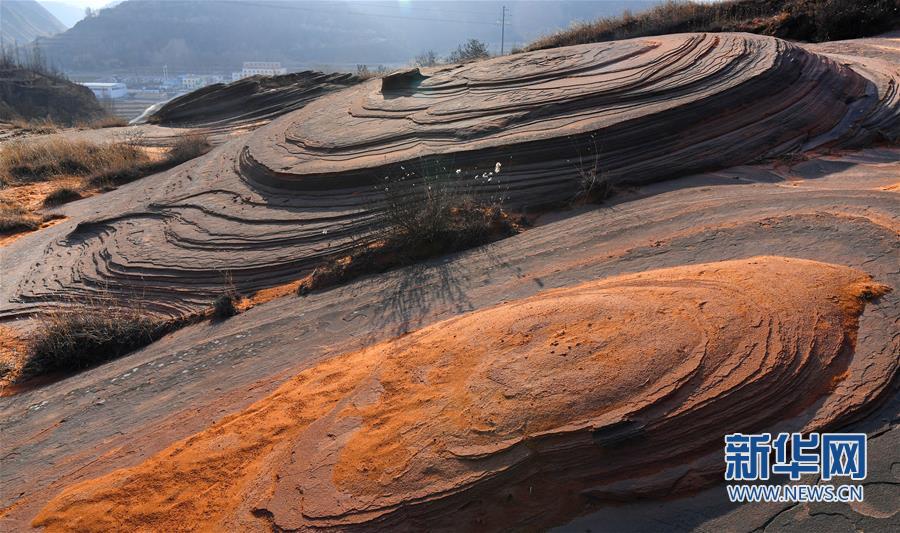 这是12月16日无人机拍摄的陕西省志丹县杏河镇丹霞地貌。在陕西省延安市志丹县杏河镇有一片美丽的丹霞地貌,这里山峦起伏,沟壑纵横,一些红砂石呈现出大小不同的螺旋状纹理,让人叹为观止。(新华社记者陶明摄)