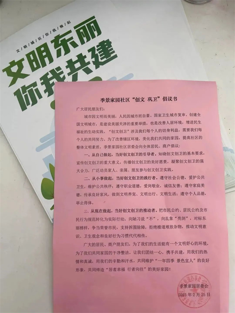 在小区宣传栏、楼栋公告栏等张贴创文巩卫倡议书,倡导广大居民请大家以主人翁的使命感和责任感,从自身做起,践行文明行为,自觉维护社区环境卫生。