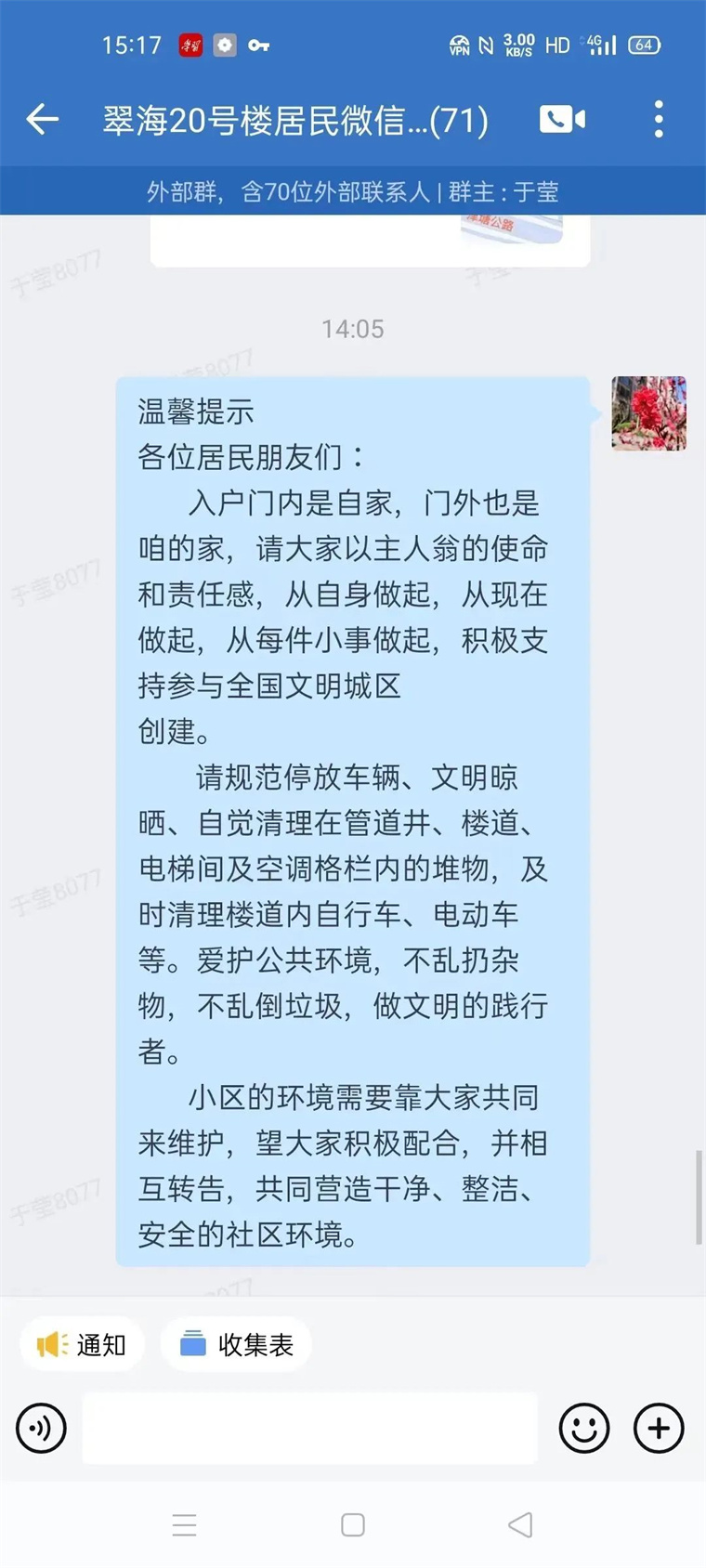 为了进一步扩大宣传范围,社区充分利用各工作群,网格员利用网格企业微信积极转发创文巩卫温馨提示,文明楼道创建,号召居民朋友们自觉配合、积极参与,为创建行动助力。