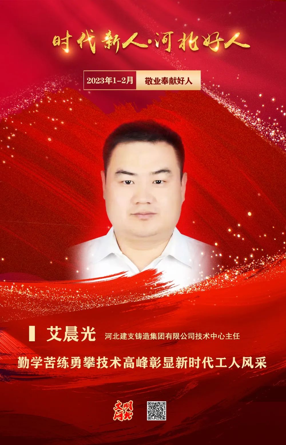 艾晨光,男,1982年4月出生,河北建支铸造集团有限公司技术中心主任。在担任公司技术中心主任期间,艾晨光积极钻研技术搞研发,在降本增效、完善工艺、总结成果、传承技艺、创新管理等方面取得了良好成效。他带领创新团队研发的“新型节能环保管件”,实现新增销售收入122527万元,创外汇2500多万美元,消耗废机铁、废钢约45万吨,取得了显著的经济和社会效益。在他的带领下,建支集团企业技术中心共获授权专利56项,参与制(修)订国家、行业、团体、企业标准35项,在国家核心刊物发表专业论文25篇。先后荣获“全国卓越铸造工程师”“全国优秀农民工”“全国铸造行业技术能手”“全国质量检验工作先进工作者”“河北省劳动模范”“河北省最美农民工”“河北省诚信建设优秀工作者”“唐山市技术创新先进工作者”“唐山市劳动模范”“唐山市最美青年”“唐山市职工道德模范”等多项国家、省、市荣誉称号。(唐山市推荐)
