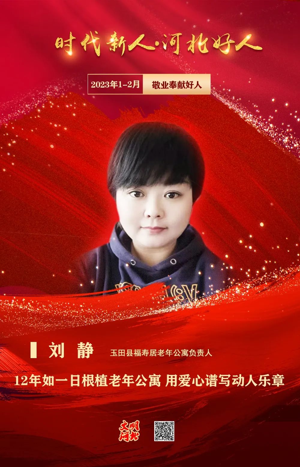 刘静,女,1992年1月出生,玉田县福寿居老年公寓负责人。刘静十二年如一日,把青春和热情深深根植在福寿居老年公寓,用微笑、爱心、细心和责任心履行对老人和家属的承诺。她每天都采购新鲜蔬菜、鸡鸭鱼肉蛋,科学营养搭配,保证老人膳食营养均衡,做到每周七天餐餐不重样,饭菜根据季节及老人们的口味随时调整,确保老人能够吃上美味可口的饭菜;她每天早上为老人擦洗身体,一年四季一天不落,确保老人身体无异味;她对标宾馆住宿标准统一白色被褥,并随时更换清洗,确保房间空气清新,干净整洁,用自己的爱心谱写出了一曲大爱的动人乐章。(唐山市推荐)